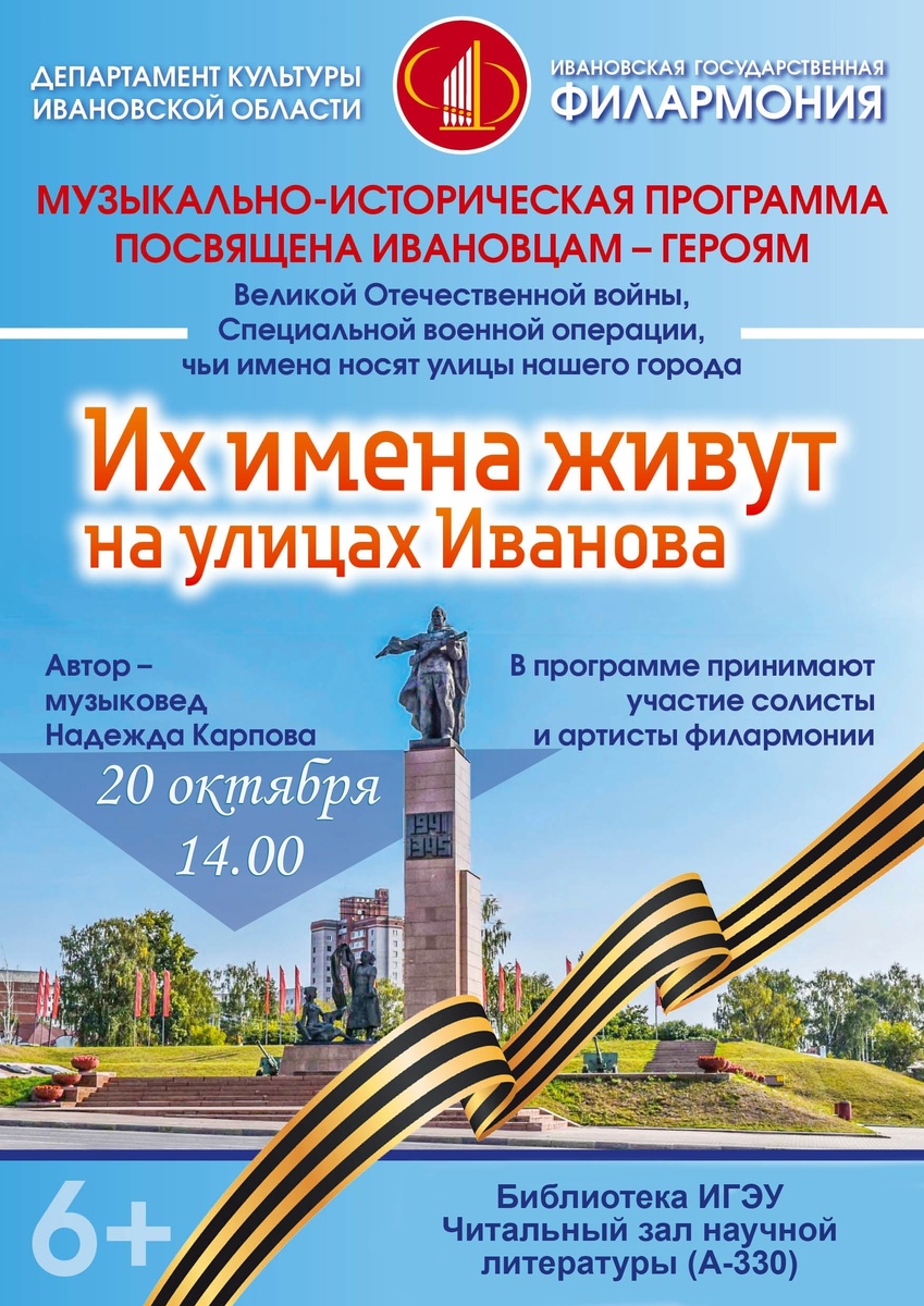 Артисты филармонии выступят в Библиотеке ИГЭУ Библиотека ИГЭУ и артисты ивановской филармонии 20 октября в 14:00 приглашают ивановцев на музыкально-историческую программу «Их имена живут на улицах Иванова» (6+). «Эта программа – подарок ВУЗу от Ивановской государственной филармонии. Посвящена ивановцам-героям Великой Отечественной войны, героям Специальной военной операции, чьи имена носят улицы нашего города», - рассказывает заместитель директора библиотеки, кандидат исторических наук Мария Николаевна Трефилова. Также 20 октября станет финальным днем работ двух выставок «Время помогать» и «Лики Победы», о которых мы ранее рассказывали. «Приглашаем посетить программу «Их имена живут на улицах Иванова» всех желающих!», - говорят организаторы. 6+