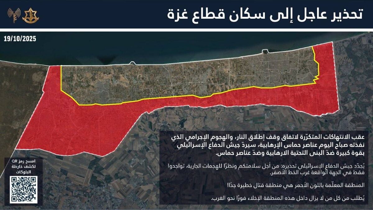 ЦАХАЛь выпустил дополнительное предупреждения для жителей Газы. Все территории помеченные красным являются зоной военных действий. Палестинцам запрещено пересекать так называемую жёлтую линию. Нарушения этого пункта соглашений будет встречено огнем на поражение.