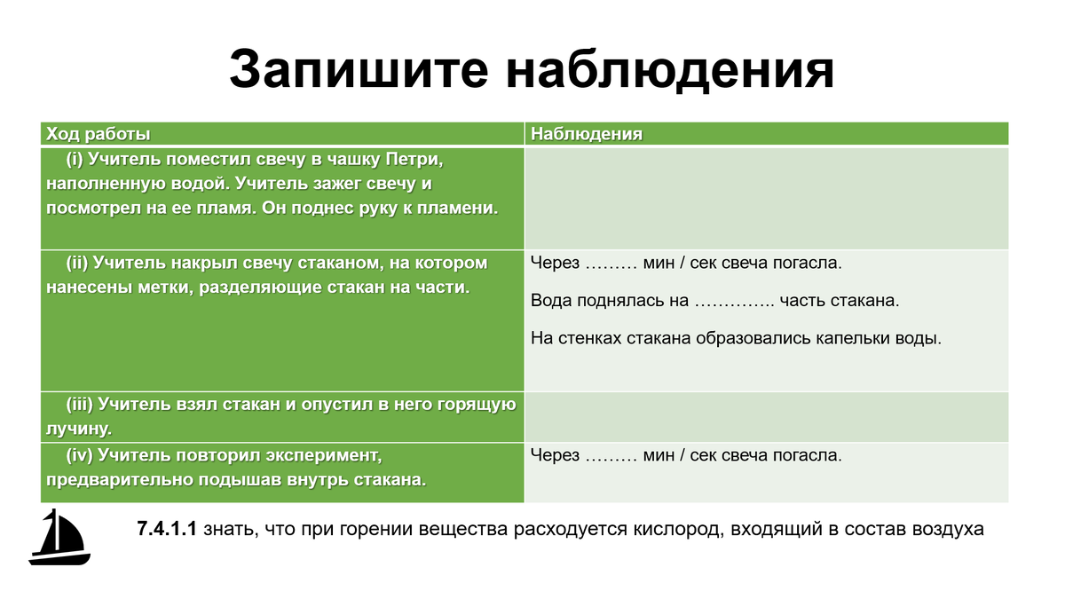 Вы собираетесь изучить реакцию горения. Внимательно прочитайте все вопросы, прежде, чем приступить к наблюдениям. (a) Предположите различия в наблюдениях экспериментов b (i) и b (iv). ……………………………………………………………………………………………………... …………………………………………………………………………………………………….. (b) Заполните колонку с наблюдениями. (c) Почему уровень воды поднимается на 1/5 часть стакана? …………………………………………………………………………………………………... (d) Почему пламя свечи медленно гаснет? …………………………………………………………………………………………………... (e) Почему горящая лучина гаснет? …………………………………………………………………………………………………... (f) Является ли горение химическим или физическим явлением? Объясните свой ответ. …………………………………………………………………………………………………... …………………………………………………………………………………………………... (g) Какие вещества были израсходованы в результате горения свечи? ………………………………… и ………………………………….. (h) Какие вещества образовались в результате горения свечи? Оксид углерода и …………………….. (i) Химическое название воды ……………………………………………………………… (j) Словесное уравнение реакции горе