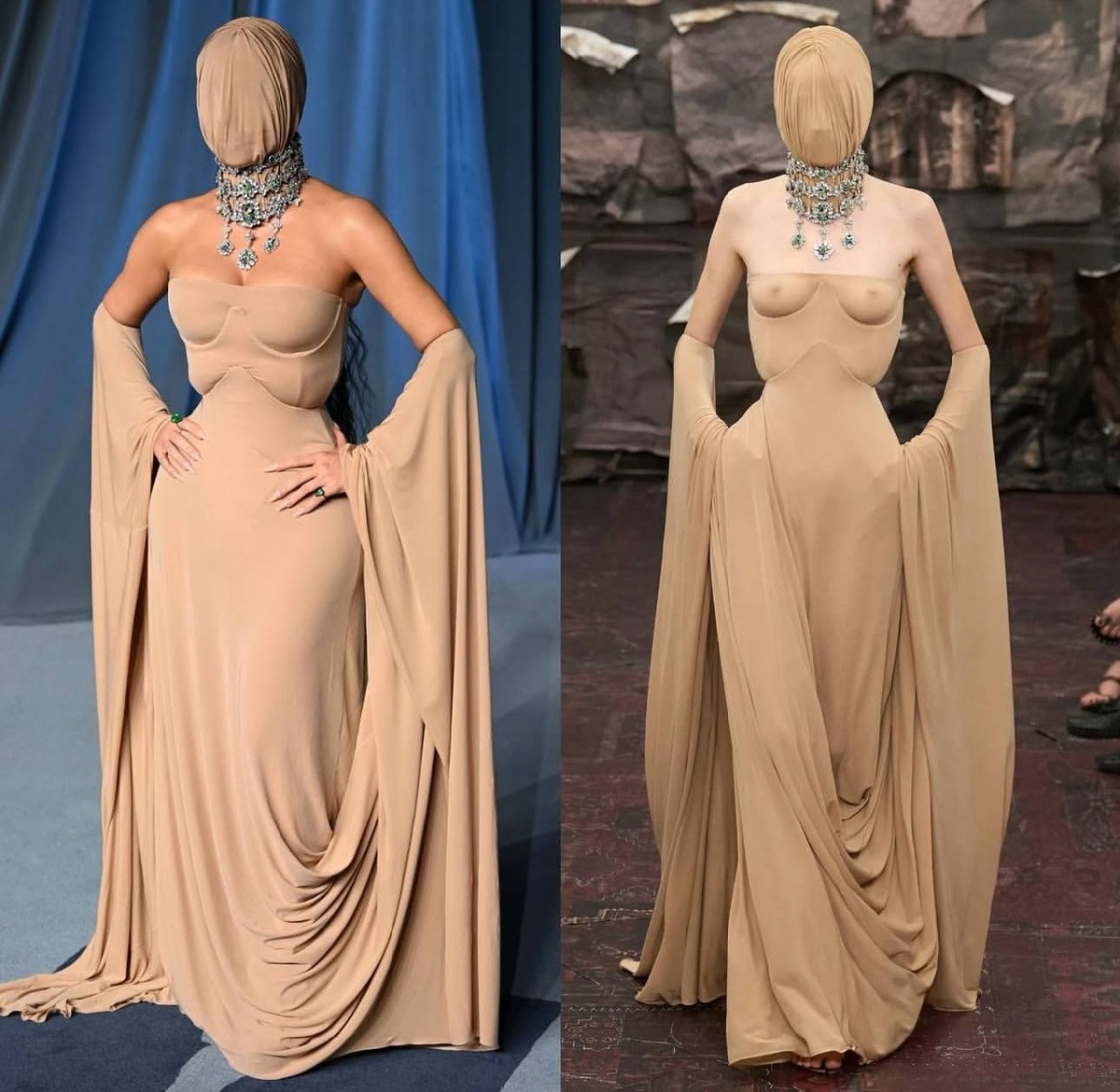 Это Ким кардашьян на Ежегодном гала-музее Академии 2025 года, в обнаженном платье от кутюр из осенней коллекции 2025 года Margiela Мне нравится на шоу гораздо больше,потому что цвет платья созвучен коже модели И общая хрупкость подчеркивает форму На Ким с ее загаром и бюстгальтером платье убито