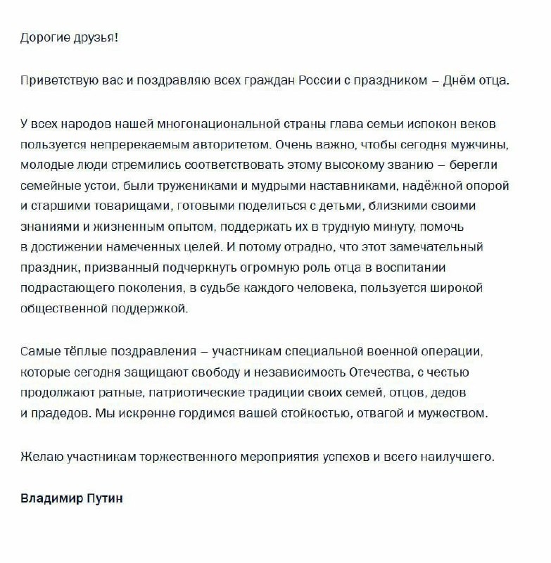 ❗️Президент Владимир Путин поздравил россиян с Днём отца