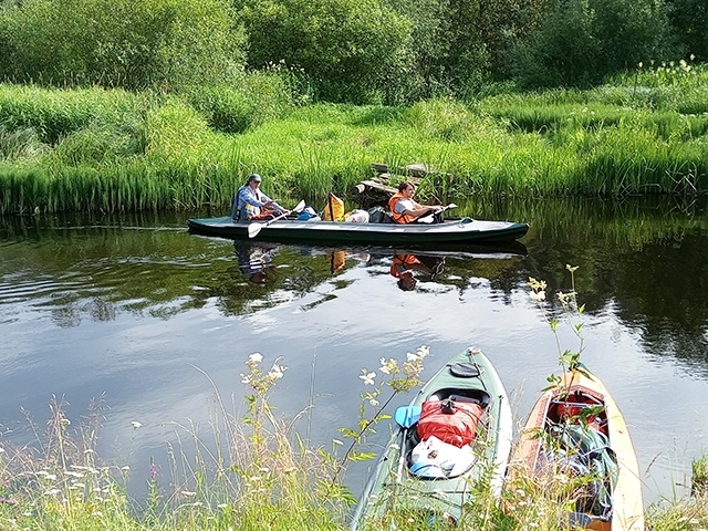 На реке – как в деревне: мимо проходишь – поздороваешься, словом перебросишься. Так весь маршрут, то забегая вперед нас, то оставаясь позади, шел вышневолочанин. В этом году у него не получилось отправиться в Карелию, куда обычно ходит на сплавы. Решил в одиночку пройти по родным рекам. Сын забросил в Фирово, оттуда направляется домой. Делимся друг с другом информацией о стоянках, впечатлениями. «Как преодолели стволы, перегородившие Граничную?» – «Пришлось подсдувать байдарку, провел по воде». Или: «Вы вчера сюда дошли? Ну, спортсмены! Я в дождь остановился». Отметили у него лайфхак – так как идет по реке один, еще и рыбу периодически ловит (на Граничной была, в Шлине не попадалась), то он сделал себе «пуповину» – веревкой к ремню привязал весло: упустить его легко, а без весла на реке нечего делать.
