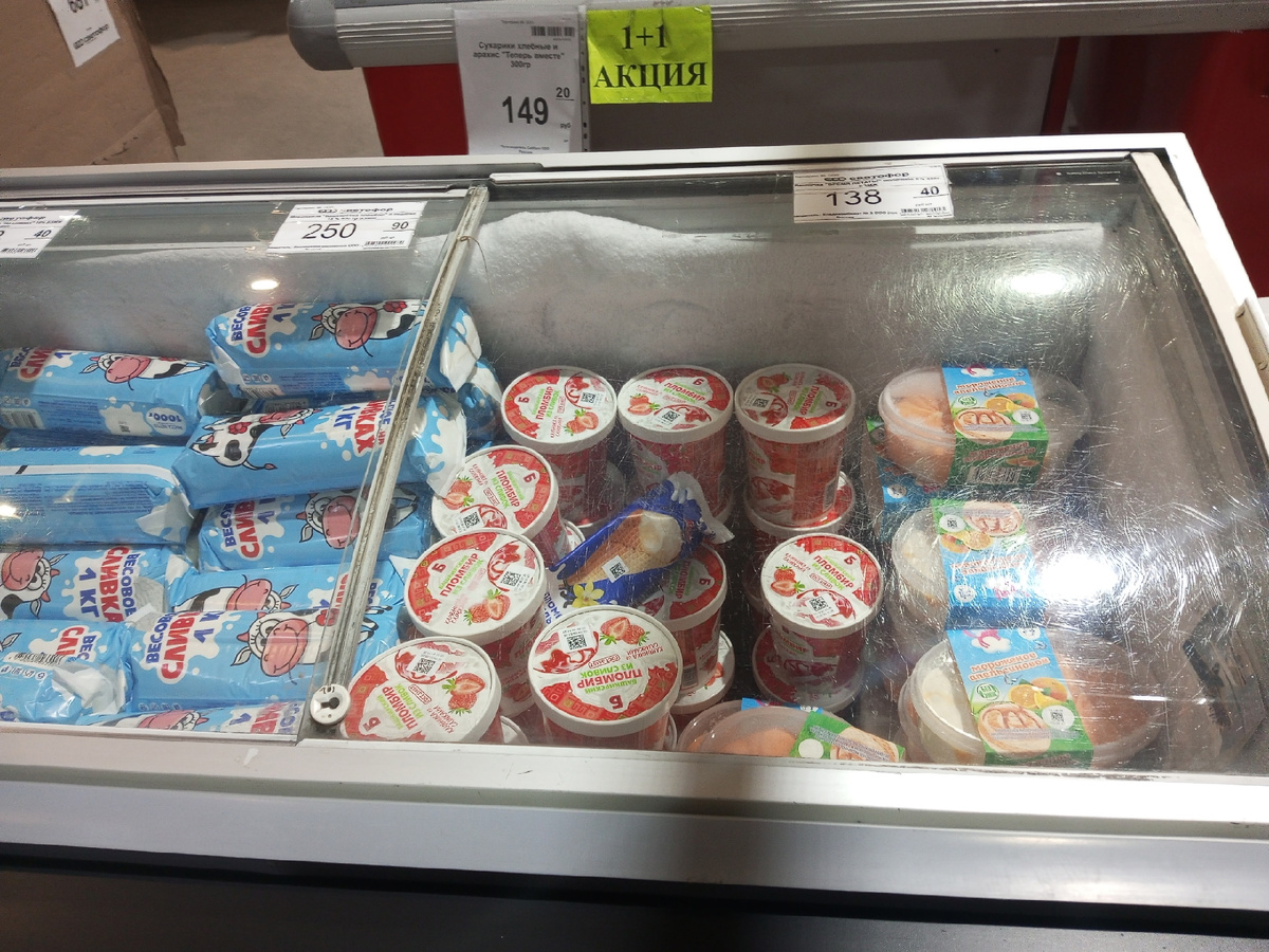 Лучшее из всего, что я просмотрела - Башкирский пломбир из сливок, он еще и со вкусом клубники со сливками, уж извиняюсь за тавтологию. Небольшие баночки, коих как раз хватит или на семью, или на несколько раз. Помимо этого были лотки с апельсиновым мороженым (тоже БЗМЖ), а также целый килограмм пломбира. И все эти покупки в пределах 300 рублей (в основном заметно меньше), что не сравнится с другими магазинами.