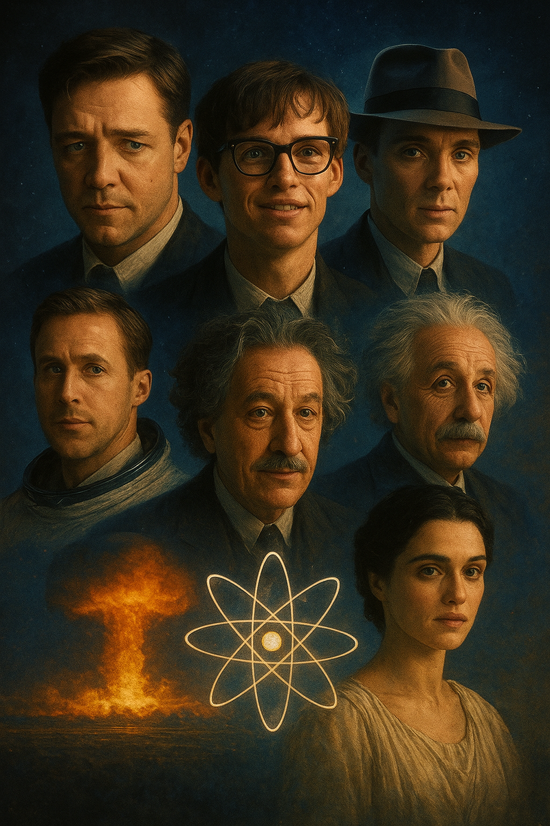 Они изменили науку, но прежде всего — себя. Эти фильмы заставляют смотреть на великих не как на легенд, а как на живых людей, борющихся со страхами, сомнениями и миром вокруг. 1. 🧮 «Игры разума» (2001) История математика Джона Нэша, который видит формулы там, где другие видят хаос. Гений и безумие — две стороны одной монеты. 2. 🌌 «Теория всего» (2014) Стивен Хокинг. Болезнь, которая приковала тело, но не сломила разум. Любовь, наука и сила духа, способная заглянуть за горизонт событий. 3. ☢️ «Опенгеймер» (2023) Человек, создавший атомную бомбу, и одновременно тот, кто понял, что наука без морали — это бездна. 4. 🌠 «Эйнштейн и Эддингтон» (2008) Два учёных по разные стороны войны доказывают, что истина важнее политики. Свет разума сильнее тьмы войны. 5. 🚀 «Первый человек» (2018) История Нила Армстронга. Полёт на Луну — это не про технологии, а про цену, которую платит человек, мечтая достичь невозможного. 6. 🧠 «Гений» (сериал, 2017–) Каждый сезон — новая история: Эйнштейн, Пи
