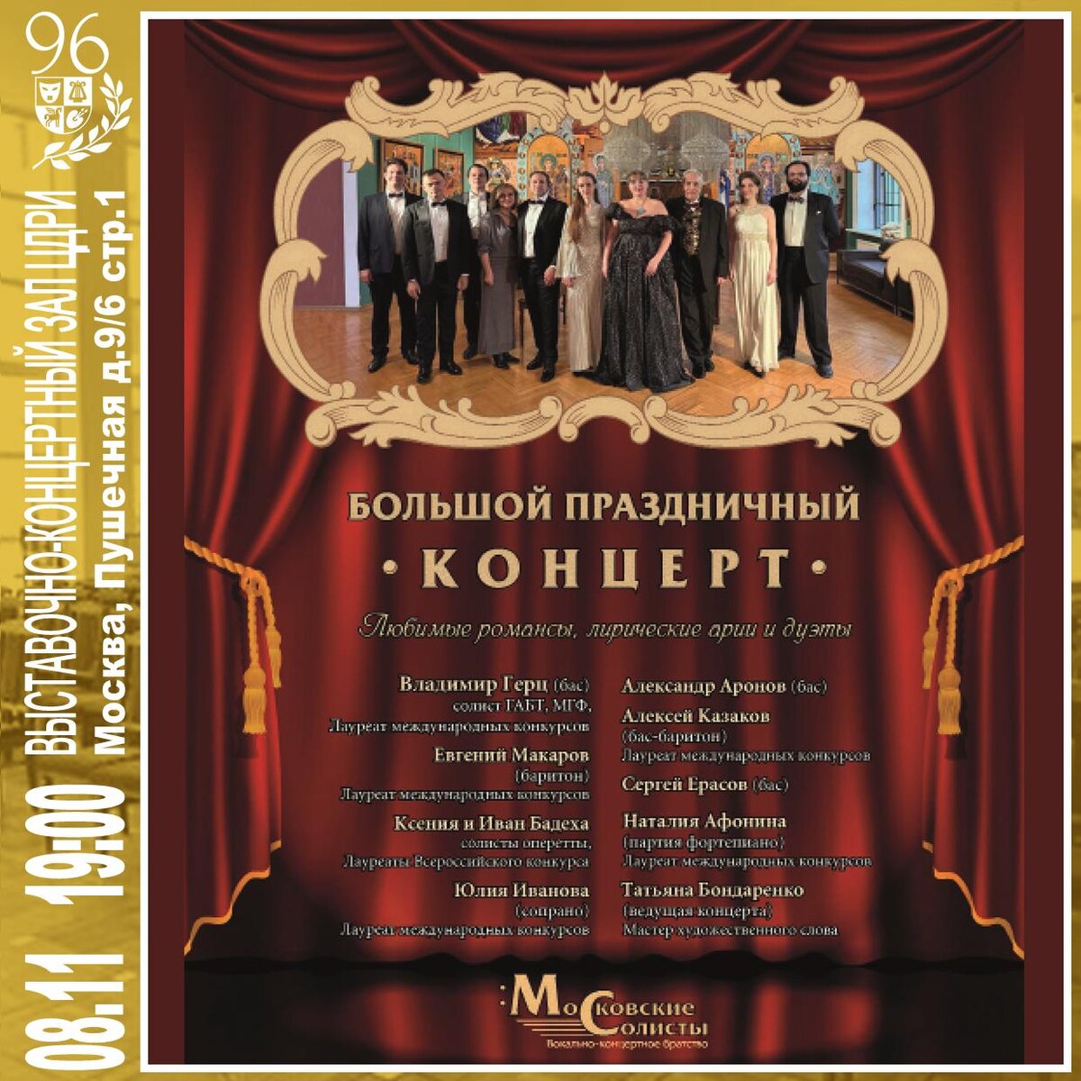 Вокально-концертное братство «Московские солисты» Большой Праздничный концерт — Любимые романсы, лирические арии и дуэты День Народного Единства напоминает нам о величии нашего народа, стойкости, удивительной сплоченности, самоотверженности, высоких моральных ценностях наших героев. Поэтому на «Праздничном концерте» мы обратимся к творчеству русских композиторов, наполненному любовью и искренним восхищением родной культурой, фольклором, яркими историческими событиями. В программе перед вами предстанет Москва в картинах из русских опер «Иван Сусанин», «Борис Годунов», «Война и мир», «Евгений Онегин», «Пиковая дама», а также «Князь Игорь», песни советских композиторов, русские народные песни. Исполнители — вокальное братство «Московские солисты» под руководством Солиста МГФ, солиста ГАБТ Владимира Герца — Лауреаты всероссийских и международных конкурсов с энергичной, творческой подачей, заряжающей зрительные залы уже 3-й сезон и влюбл