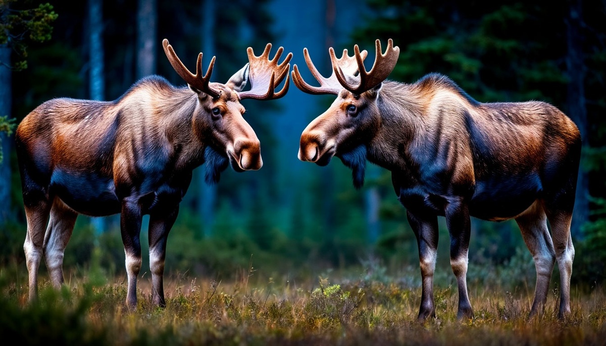 Ночь была тихой и теплой. Лес дышал свежестью, воздух пах хвоей и травами. Луна ярко светила сквозь густые кроны деревьев, создавая причудливые тени на земле. Именно в такую ночь судьба свела двух самцов и одну лосиху на маленьком солонце среди леса. Солонец — особое место для лосей. Это источник минеральных веществ, необходимых животным для поддержания здоровья. Но кроме пользы, солонцы привлекают внимание еще одним важным аспектом — здесь часто происходят встречи, которые могут решить судьбу каждого животного. Первым появился молодой лось. Его глаза внимательно осматривали окрестности, уши настороженно ловили каждый шорох. Несмотря на свою молодость, он уже успел набраться опыта в лесных играх судьбы. Однако сегодня его сердце билось быстрее обычного. Причиной этому стала лосиха, чей след он недавно обнаружил неподалеку. Она появилась вскоре после него. Ее грациозная походка и спокойный взгляд говорили о зрелости и уверенности. Лосиха осторожно подошла к солонцу, опустив голову, нач