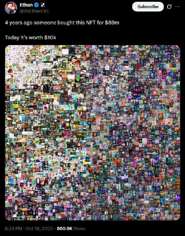 Привет, друзья! Сегодня мы разберём удивительный и поучительный кейс из мира NFT — падение цены одной из картинок с астрономических 69 миллионов долларов до жалких 10 тысяч. Этот пример наглядно демонстрирует, как быстро могут меняться правила игры на рынке цифровых активов. NFT-искусство, будучи на пике популярности, оказалось крайне уязвимым к изменениям в восприятии и трендах. Всего за несколько лет мы видим, как некогда баснословно дорогая картинка обесценилась в десятки раз. Это говорит о том, что рынок NFT всё ещё крайне волатилен и непредсказуем. Инвесторы и коллекционеры должны быть готовы к резким колебаниям цен и тщательно анализировать каждый актив перед покупкой. Кроме того, этот случай поднимает вопрос о том, что такое ценность в мире цифровых активов. Если картинка, которая ещё вчера стоила миллионы, сегодня никому не нужна, то какова её реальная стоимость? Возможно, мы наблюдаем начало коррекции на рынке NFT, где завышенные цены на некоторые активы были обусловлены скоре