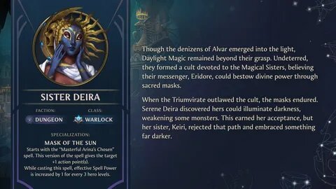 «Многие жители Альвари расстались со своими близкими после того, как покинули их и изменились Бездной. Несмотря на решение ее старшей сестры бросить Альвар ради чего-то более зловещего, сестра Дейра остается путеводной звездой для тех, кто бросает вызов тьме. Давайте узнаем ее историю!