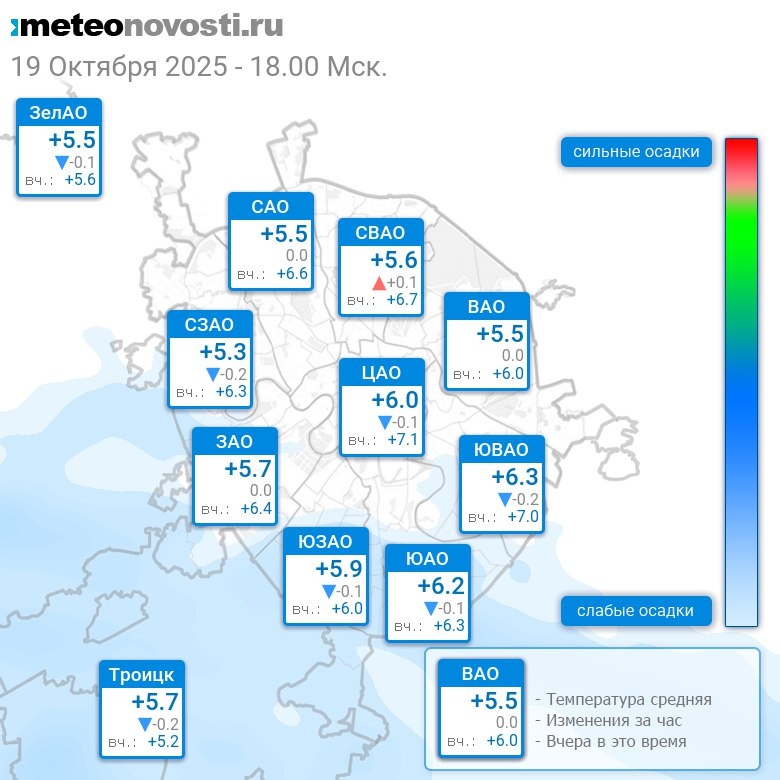 В 18:00 в Москве было от +4.9°C до +6.5°C, средняя температура +5.8°C #погода #Москва #осень #температура #19октября #воскресенье Перейти на сайт Прогноз погоды на 14 дней