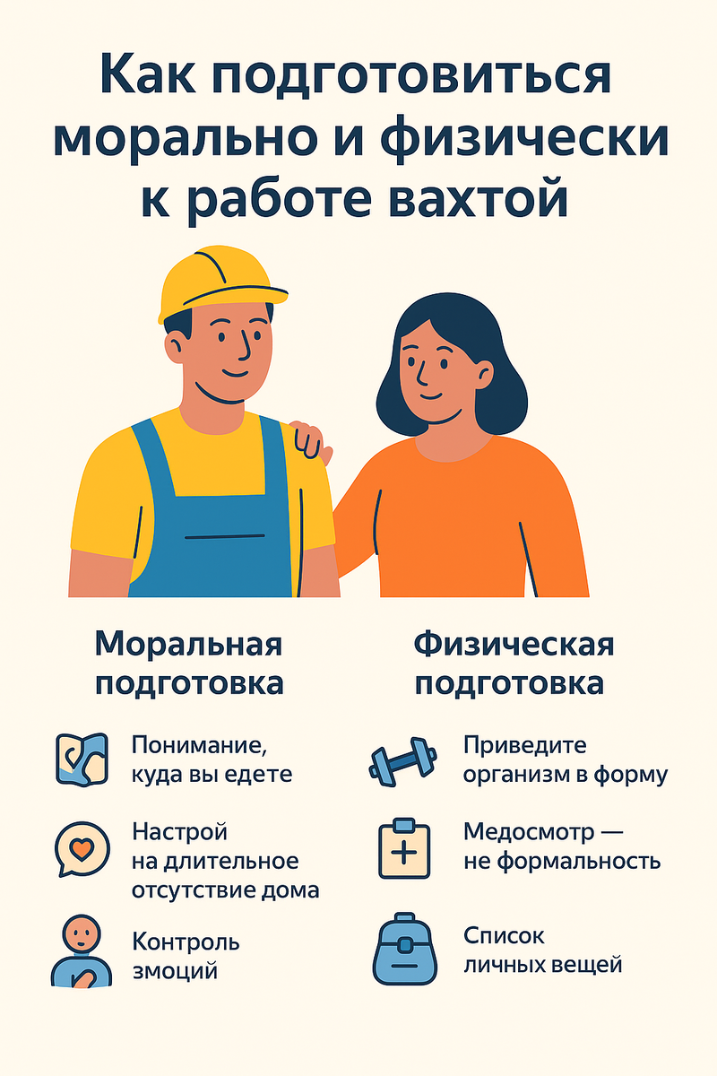 Разберём, как правильно подготовиться морально и физически, чтобы вахта прошла спокойно и без стресса. Перед выездом изучите условия: регион, климат, проживание, распорядок дня.