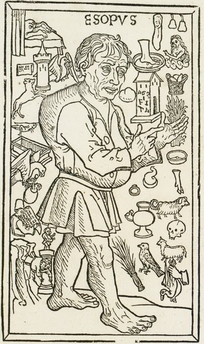 Изображения баснописца Эзопа на немецкой гравюре 1479 года, нидерландской миниатюре XVI века и русских миниатюре XVII века и гравюре XVIII столетия.