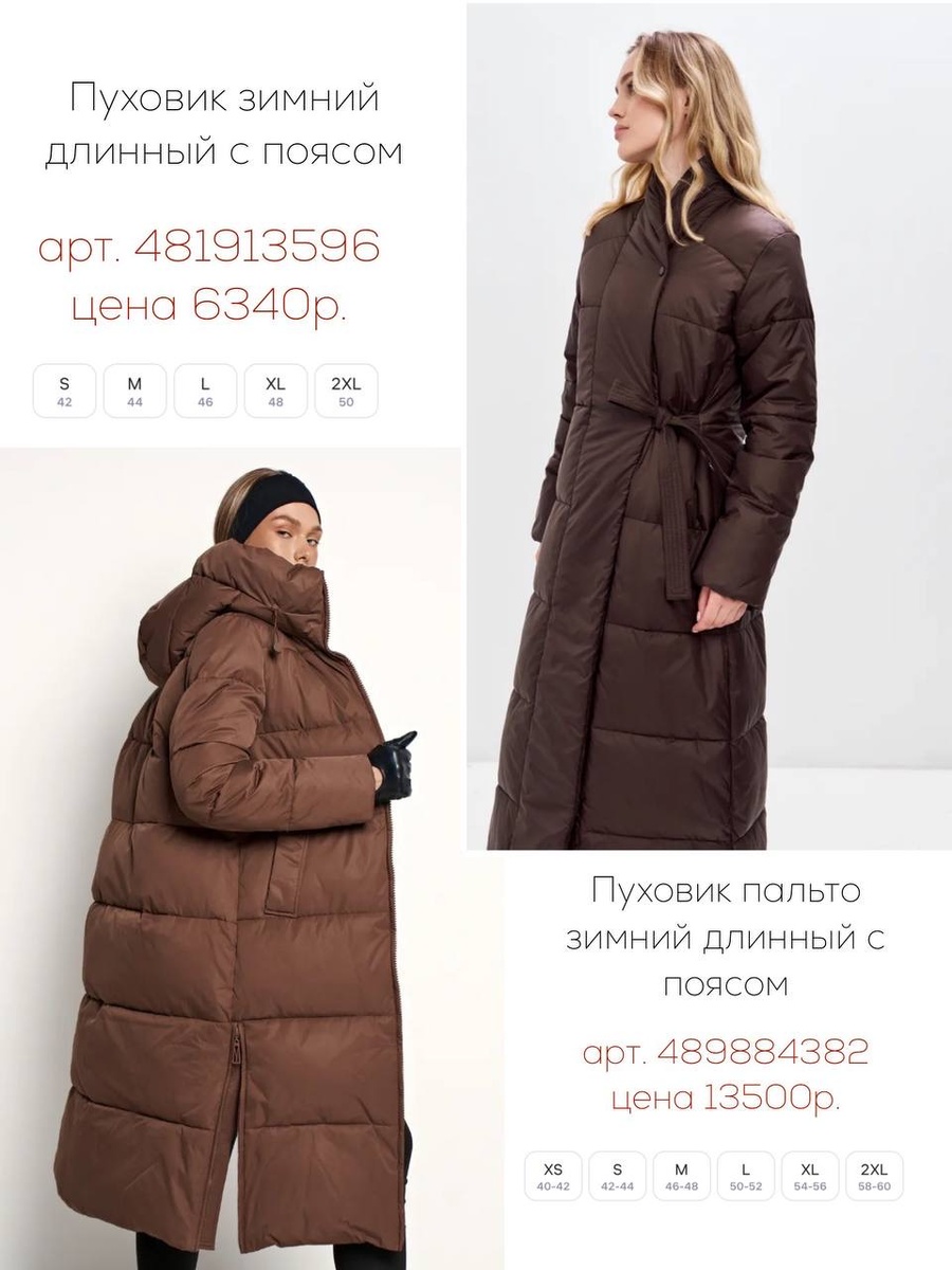 Зима — не повод уходить в серые тона и бесформенные силуэты. Сегодня собрала для вас капсулу тёплых верхов и «правильных» моделей, которые согреют и при этом подчеркнут фигуру. Идём строго по порядку, как на фото, с артикулами и подробностями. Силуэт и посадка. Удлинённая модель с мягкой простёжкой и поясом формирует талию и вытягивает силуэт. Высокий воротник и объёмный капюшон держат тепло и защищают от ветра. Разрезы на молнии снизу дают шаговую свободу. Материалы и комфорт. Верх — плотная ткань с водоотталкивающей пропиткой, наполнитель лёгкий и тёплый. Пояс фиксирует объём, не давая пуховику расширять фигуру. С чем носить. Идеален с вязаными платьями, джинсами прямого кроя, высокими сапогами на тракторной подошве. Цвет шоколада дружит с молочными и серыми оттенками. Совет стилиста. Для «офисного» образа добавьте высокие перчатки и замшевую сумку тёплого бежа — декоративные акценты смягчат объём и создадут дорогой вид. Силуэт и детали. Более «горожанский» вариант: диагональная пр