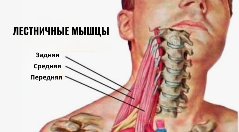 Лестничная мышца — это не одна, а целых три пары мышц на передне-боковой поверхности шеи. Они соединяют шейные позвонки с двумя верхними ребрами.