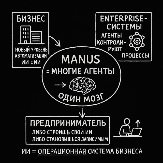 Manus: сотни ИИ-агентов работают как один мозг. Стартап Manus запустил систему Wide Research - сотни нейроагентов решают одну задачу вместе. Каждый отвечает за свой кусок: сбор данных, анализ, проверку. В итоге - быстрее и точнее, чем команды людей. Что это значит для бизнеса: 1. Появился новый уровень автоматизации. Не человек с ИИ, а ИИ с ИИ. Машины уже умеют взаимодействовать между собой без человека. 2. Это основа новых enterprise-систем. Агентская архитектура берёт под контроль целые процессы - от анализа до отчёта. 3. Через пару лет появятся автономные бизнес-цепочки, где люди не нужны даже для контроля. Для предпринимателей: - Либо ты начинаешь строить свои системы с ИИ, - либо будешь покупать готовые - и зависеть от тех, кто уже построил. Вывод: ИИ перестаёт быть инструментом. Он становится операционной системой бизнеса. И если ты не проектируешь место для него в своей компании, скоро он спроектирует место для тебя - снаружи. Канал: 🧠 Второй Мозг #AI #искусственныйинт
