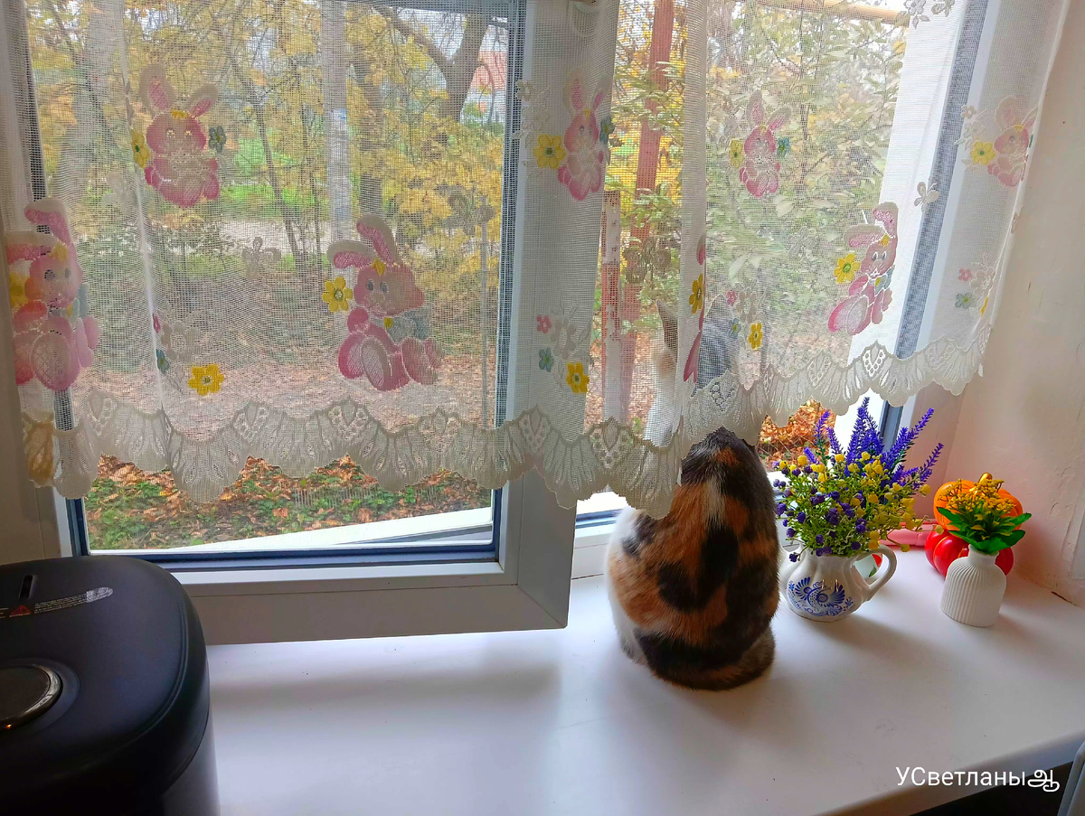 На улице сегодня прохладно, но я открыла окно, что бы запустить прохладный воздух, так как сильно топят в квартире, а кухню мы на ночь запирали от пушистиков, что бы не лазили по столам, а то ж им всё дозволено. Поэтому в запертой кухне воздух скопился тёплый, здесь без открытого окна никак.