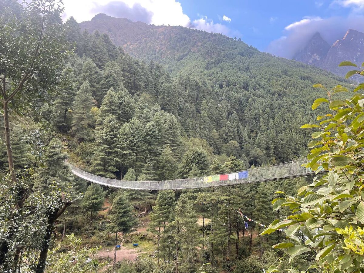 По дороге прошли огромный подвесной мост, встретили множество яков, ознакомились с ассортиментом товаров в магазинах (зацените название лоджа – Four seasons – не больше не меньше), встретили маленькую девочку с котёнком, которая просто светилась от счастья и охотно позировала.
