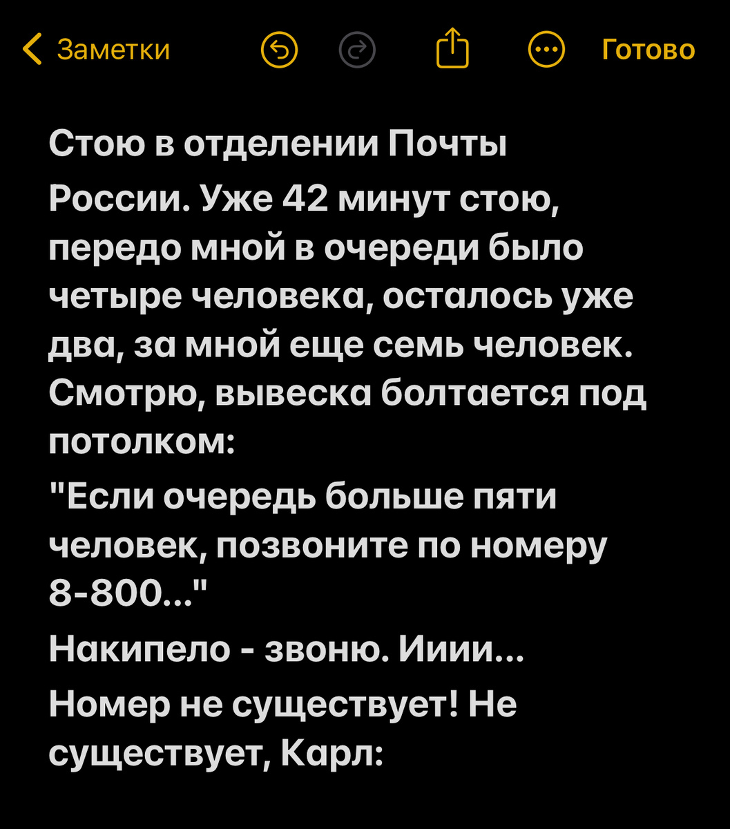 В «Почте России» висела вывеска: «Если очередь больше пяти человек — звоните 8-800...». Я прождал 40 минут и набрал номер. Оказалось, он не существует. Вот так служба заботы о клиентах!