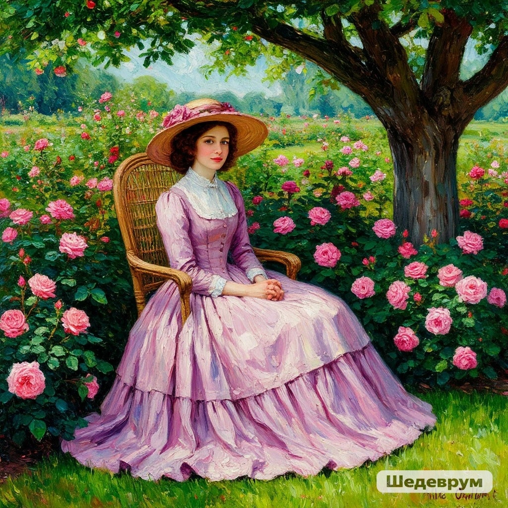 Под деревом раскидистым В саду, объятом розами, Июльским днём безоблачным Сидит русоволосая. Как тишина спокойная, Вся в дымке света – ясная. Так горячо любимая, И потому прекрасная! Плетёт венок ромашковый. Реки дыханье нежное Ковёр травы фисташковой Окутывает свежестью. Как будто небом соткана, Сидит земная женщина. Как облако свободная, Как ветерок изменчива. Это моё старое стихотворение, было выставлено на другой площадке, но та куда-то делась. Сейчас пытаюсь восстановить публикации от туда) Стихотворение по картине. Картину не выставляю - сами угадывайте)