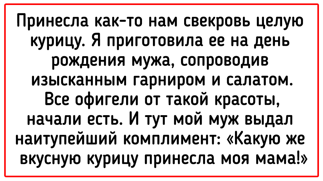 - Принесла как-то нам свекровь целую курицу. Я приготовила ее на день рождения мужа, сопроводив изысканным гарниром и салатом. Все офигели от такой красоты, начали есть. И тут мой муж выдал наитупейший комплимент: «Какую же вкусную курицу принесла моя мама!» © Палата № 6 / VK