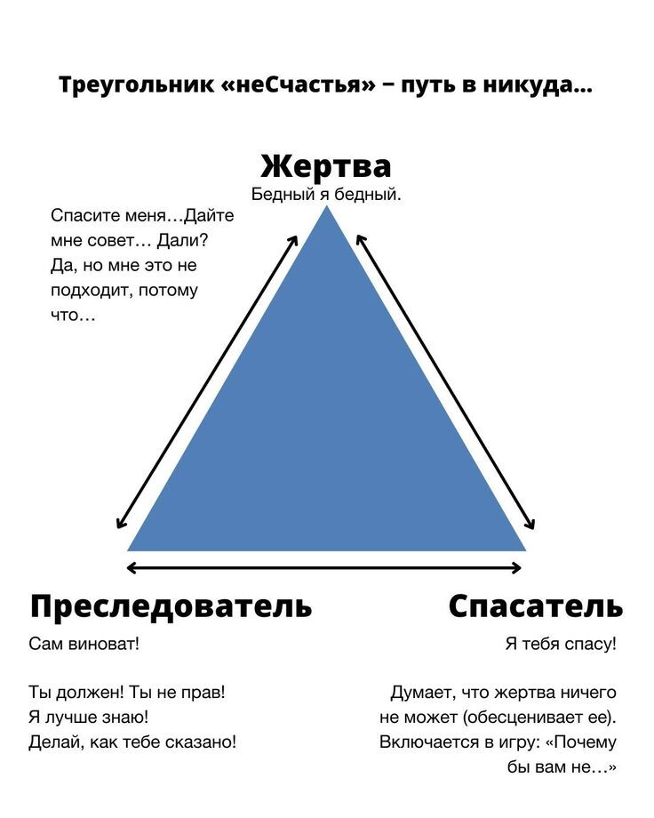 В психологии существует такое понятие как треугольник Карпмана . Давайте разберём что это. Иногда мы играем разные роли. Например очень удобна позиция ЖЕРТВЫ: -"Мне плохо" "-Жизнь просто невыносима" "-Жизнь не справедлива ко мне" -"Весь мир против меня ". Человек находясь в состоянии ЖЕРТВЫ искренне считает ,что он самый несчастный человек ,при этом ничего с этим не делает.Но очень хочет (на подсознательном уровне) находится в этой позиции,поэтому так же на подсознательном уровне находит себе ПРЕСЛЕДОВАТЕЛЯ (АГРЕССОРА),который будет его обижать,унижать,эксплуатировать . Конечно же находится так называемый СПАСАТЕЛЬ,который считает себя не полноценным человеком ,если не помогает кому-нибудь .Но в этом кроется ловушка: Часто помогая мы лишаем человека возможности самому что-то предпринять. ПРИМЕР: В детстве девочку часто наказывали,она привыкла,что всегда есть кто-то сильнее её ,кто её будет угнетать.Она вырастает и находит себе такого партнёра( абьюзера ),он в свою очередь прекрасн