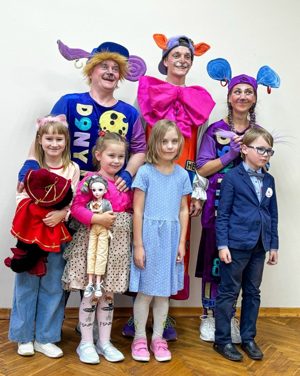 После спектакля "Приключения кота Леопольда". Артисты вместе с самыми активными юными зрителями.