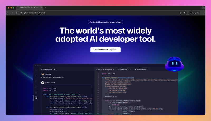 GitHub Copilot, запущенный в 2021 году, является первым ИИ-помощником для парного программирования, который внедрил генерацию кода в основную разработку. Поддерживаемый Microsoft и OpenAI, он получил широкое распространение благодаря глубокой интеграции с популярными IDE и экосистемой GitHub. Он позиционируется как универсальный помощник в кодировании, ускоряющий разработку программного обеспечения, предлагая код в режиме реального времени. Стратегическая ценность этого инструмента заключается в его тесной связи с рабочими процессами разработчиков (в VS Code, Visual Studio, JetBrains, Neovim) и постоянных улучшениях, таких как Copilot Chat, использующий передовой ИИ. Его часто используют в качестве эталона, с которым сравнивают других помощников по кодированию, из-за его раннего старта в реальном использовании.