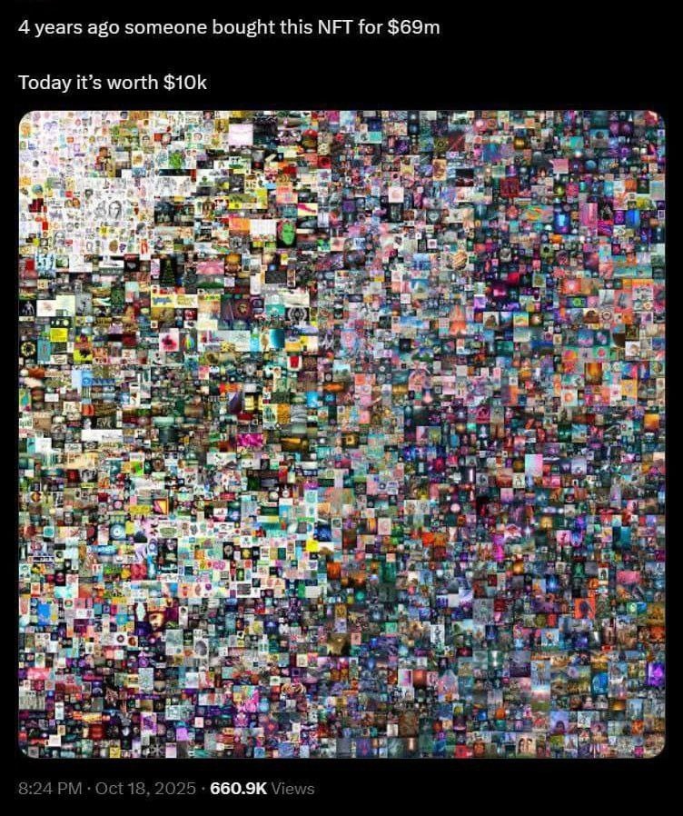 NFT, купленная на пике за $69 млн, сейчас оценивается примерно в 7 тыс. раз дешевле🤦♂