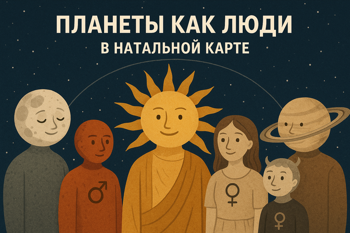 🌗 Планеты — это не только энергии. Это люди в твоей жизни. Когда мы смотрим на натальную карту, часто думаем: «Вот Солнце — это папа, Луна — мама, и всё ясно». Но всё гораздо интереснее. Любая планета может «оживать» через конкретного человека. Солнце Часто символизирует отца, но не только. Это может быть начальник, муж, учитель, человек, у которого ты ищешь признание и одобрение. Через фигуру Солнца ты узнаёшь, что такое сила, уверенность и воля к жизни. Луна Это не просто «мама» — это женщина, дающая тебе чувство безопасности. Это может быть мама, бабушка, сестра, подруга, а иногда и твой собственный ребёнок, через которого ты учишься заботе и мягкости. Меркурий Вечно молодой архетип — брат, сестра, друг, коллега, сосед, с кем ты разговариваешь, учишься, обмениваешься мыслями. Он показывает тех людей, которые двигают тебя через слово, общение и любопытство. Венера Женщина, которую ты любишь или ею восхищаешься. Подруга, возлюбленная, дочь, муза, артистка. Иногда Венера проявляется к