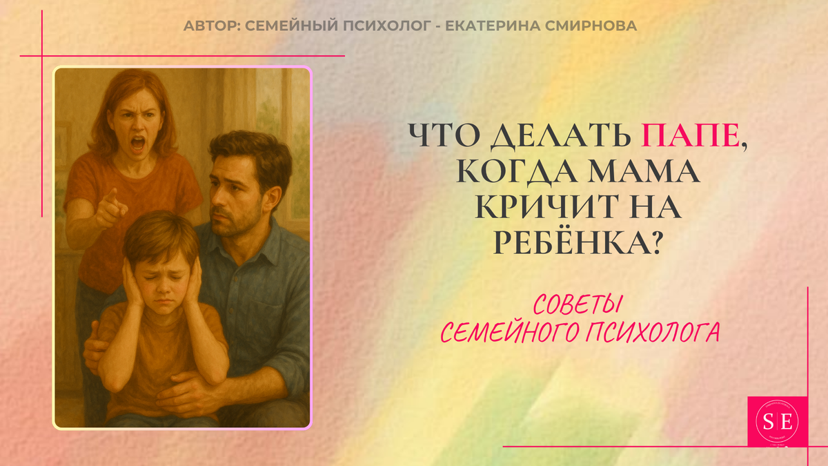 Автор: Екатерина Смирнова — семейный психолог, эмоционально-фокусированный терапевт, опыт с 2017 года Ситуация: вы слышите, как мама кричит на ребёнка. Голос на повышенных тонах, слёзы, испуг в глазах малыша — и у вас сжимается всё внутри. Но что делать? Вмешаться? Защитить? Помолчать, чтобы «не усугублять»? Очень часто папы в такие моменты чувствуют растерянность, бессилие и вину, но не понимают, как правильно действовать. В этой статье — мягкие и уважительные шаги, как быть опорой и для ребёнка, и для партнёрши. Важно понимать: крик — это не про злость на ребёнка, а чаще — сигнал внутреннего перегруза. Это не оправдание. Но понимание причины помогает не нападать, а помочь. Если оба родителя на эмоциях — ребёнку становится страшнее. Ваша ровная, уверенная интонация даёт всем участникам ощущение безопасности. Подойти, обнять, сказать: «Я с тобой. Всё хорошо. Мама злиться, на твое поведение, потому что так делать нельзя, но она любит тебя.». Это не обесценивание мамы, а поддержка ребён