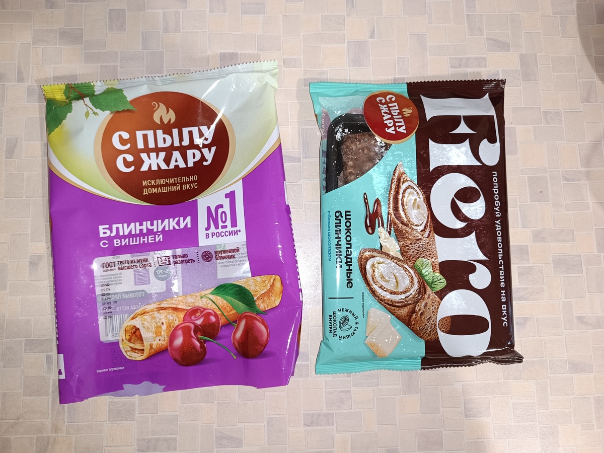 Что-то новенькое увидела в морозильнике в магазине Пятерочка, решила попробовать. Зацепили, конечно, блинчики-рулетики с шоколадом. Но решила и с вишней тоже купить. Обратила внимание только потому, что они упаковку поменяли на вишню. А с белым шоколадом я ни разу и не пробовала. Как раз и разберем состав.