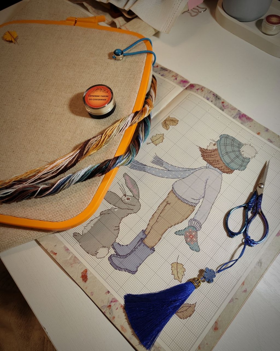 Что по вышивке?... Пока из самого актуального: в пяльцах осенние Belle&Bo в рамках Бумажного СП ... Вышито чуть более 1000 крестиков за 2 дня. Вышивается очень легко, так как большими участками шьётся одним цветом. Это довольно примитивная картинка, но тем она и мила) Бэкстич тут простейший, угловатый. И я на днях приобрела наконец-то себе деревянный держатель для пялец. Вполне себе удобная штука, не Марта конечно, но со своей задачей справляется хорошо. Самые большие пяльца держит отлично. Шьём дальше) 🕯️🍂 В видео постаралась передать вам мой релакс от процесса)