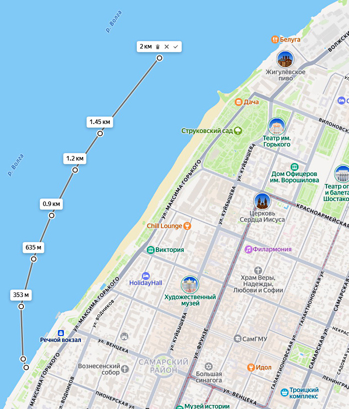 С судового хода напротив Красноармейского спуска можно рассмотреть синий купол Самарской государственной филармонии, которая находится на углу улиц Фрунзе и Л.Толстого.