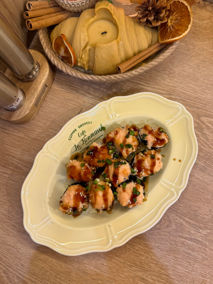 🛒 Ингредиенты: Для риса: 🍚 Рис — 1 стакан 💧 Вода — 2 стакана 🍶 Рисовый уксус — 4 ст. л. 🧂 Соль — ½ ч. л. 🍬 Сахар — ½ ч. л. Для начинки: 🦀 Крабовые палочки — 200 г 🧀 Творожный сыр — 150 г 🥄 Майонез — 2 ст. л. 🥒 Огурец — 1 шт Для «шапочки»: 🧀 Твёрдый сыр — 100 г (натереть) 🐟 Икра мойвы с креветкой — 1 банка 🥄 Майонез — 2 ст. л. Для подачи: 🌿 Соус терияки, зелёный лук, кунжут, соевый соус 👩🍳 Рецепт: 1. Промойте рис до прозрачной воды, залейте 2 стаканами воды и варите под крышкой на слабом огне до готовности. 2. Разогрейте уксус с солью и сахаром (не кипятите!) и залейте заправкой рис, перемешайте. 3. Смешайте крабовые палочки, творожный сыр и майонез. 4. В отдельной миске соедините тертый сыр, икру и майонез — получится нежная и тягучая смесь. 5. На треть листа нори влажными руками распределите рис. 6. Выложите начинку из крабовых палочек, добавьте длинные ломтики огурца. 7. Аккуратно сверните ролл, смазав край водой, чтобы он держал форму. 8. Нарежьте ролл порционн