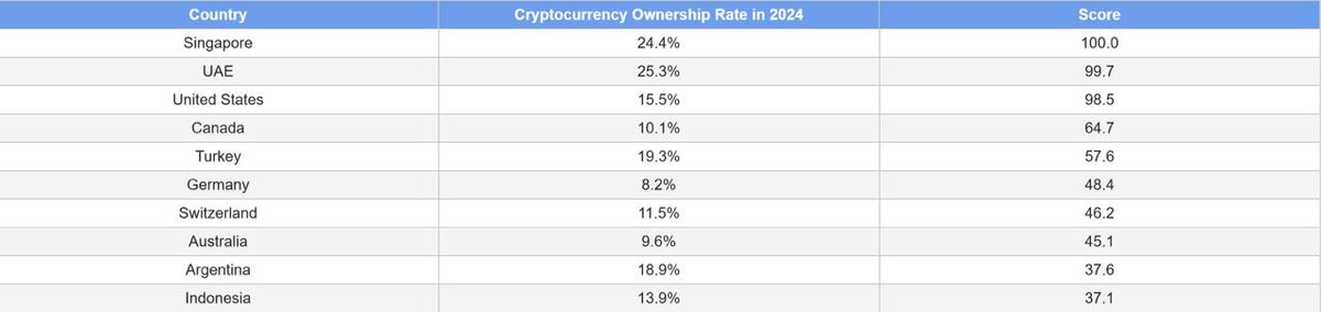 🔥 BULLISH ALERT: Singapore and UAE are flexing as the world's top "crypto-obsessed" nations! 🌍 According to the ApeX Protocol report, Singapore scored a perfect 100 with 24.4% of its peeps owning crypto, while the UAE isn’t far behind at 99.7% with 25.3%! 🚀💰 #CryptoCulture #InvestSmart