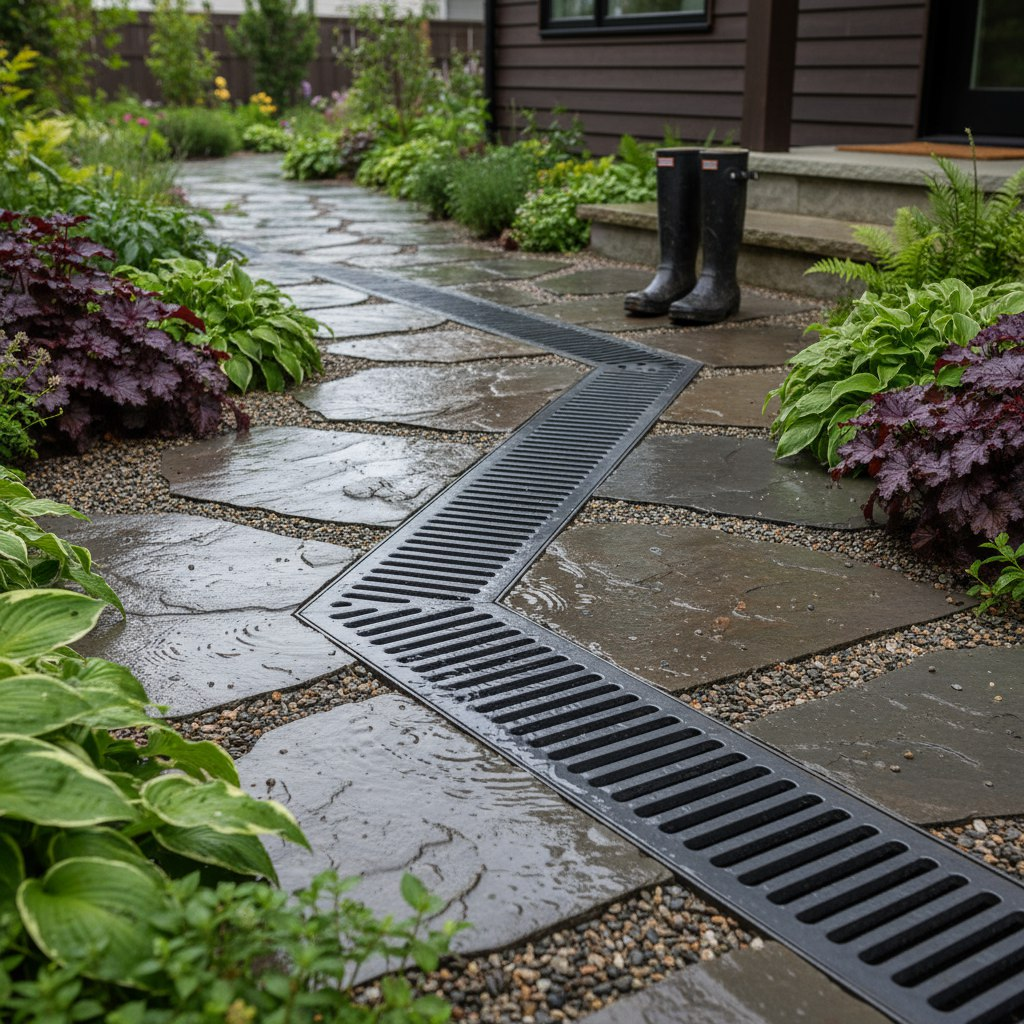 - Линейные лотки у гаража/террасы — собирают поток и отправляют его в дождевой сад.