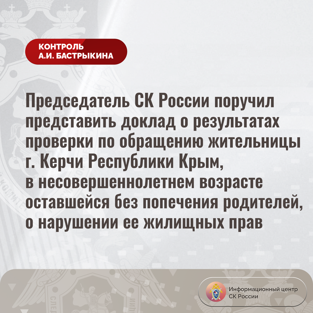 Председатель СК России поручил представить доклад о результатах проверки по обращению жительницы г. Керчи Республики Крым, в несовершеннолетнем возрасте оставшейся без попечения родителей, о нарушении ее жилищных прав В Информационный центр СК России обратилась жительница города Керчи Республики Крым, в несовершеннолетнем возрасте оставшаяся без попечения родителей, по вопросу непредоставления ей положенного по закону жилья. С 2018 года девушка состоит на учете лиц, подлежащих обеспечению жилыми помещениями, однако до настоящего времени ее права не реализованы. Многочисленные обращения в уполномоченные органы результатов не принесли. В ГСУ СК России по Республике Крым и городу Севастополю по поступившему обращению организована процессуальная проверка. Председатель Следственного комитета Российской Федерации Александр Иванович Бастрыкин поручил руководителю ГСУ СК России по Республике Крым и городу Севастополю Владимиру Николаевичу Терентьеву доложить о промежуточных результатах процес