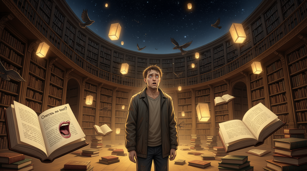 Буквально — пол под ногами исчез, и он оказался в огромном зале, где полки уходили в бесконечность, а книги переговаривались шёпотом.