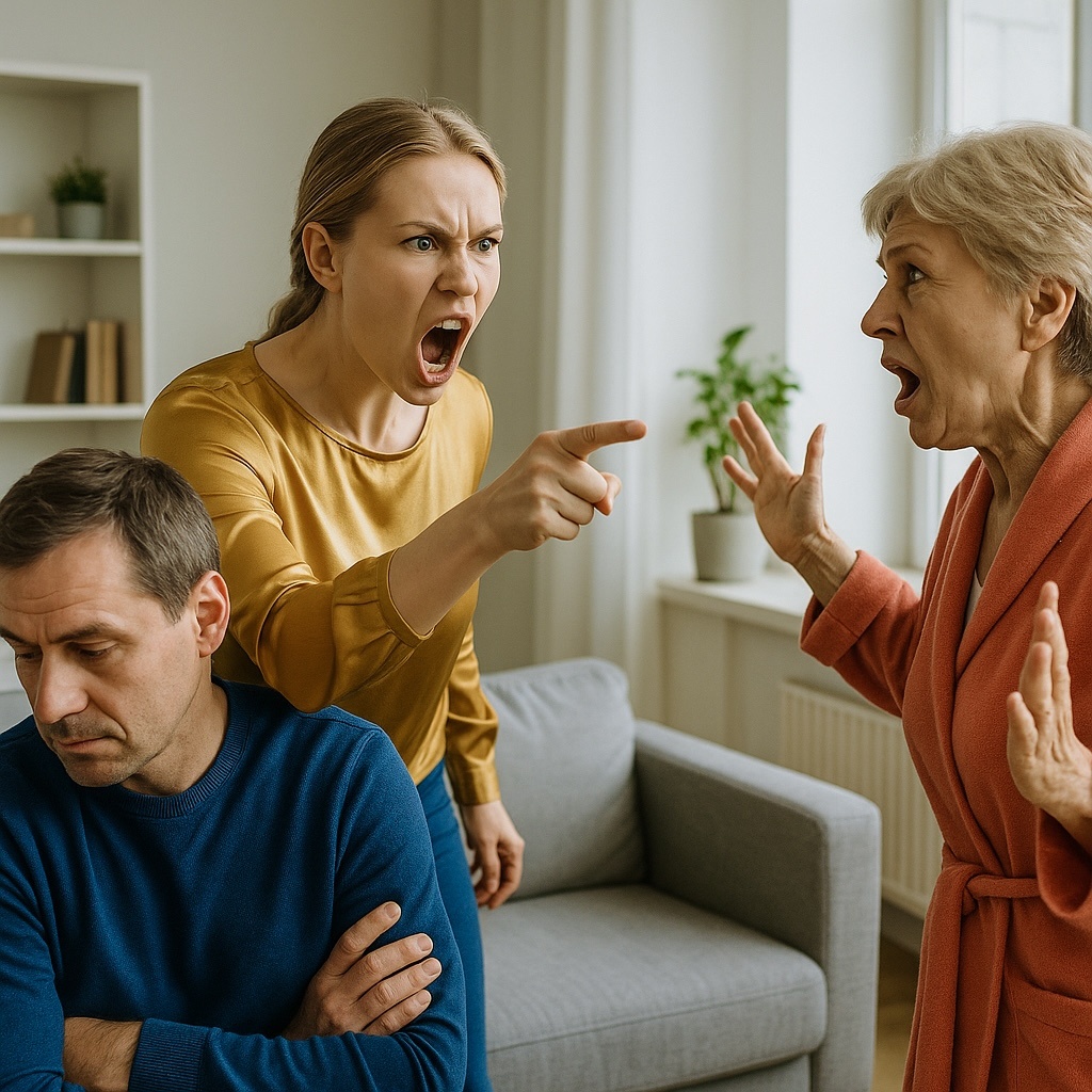 Тут из кухни вышла свекровь. Людмила Борисовна. В новом халате — шёлк, бордовый, дорогой. На пальцах кольца блестят.