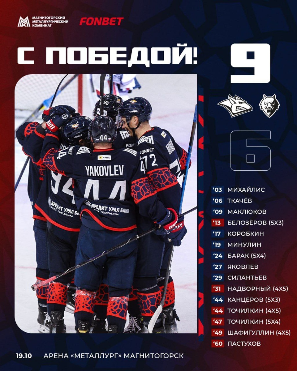 🦊 Стальной Лис 9 — 6 🐺 Химия Волк Сумасшедший матч, просто невероятный. Целых 15 шайб – второй результат в истории лиги. «Металлург» так и вовсе впервые в своей истории забросил 9 в одном матче Все залетало, к середине второго периода подопечные Разина забросили 8 шайб всего лишь с 15 бросков в створ, сумасшедшая реализация Но и «Нефтехимик» не сдался после счёта 8 – 1 и продолжал бороться, хотя все уже понимали результат Интересный момент: да весь матч интересный. Но особенно выделяется то, что «Нефтехимик» забросил целых три шайбы в меньшинстве 🦊 7069 зрителей