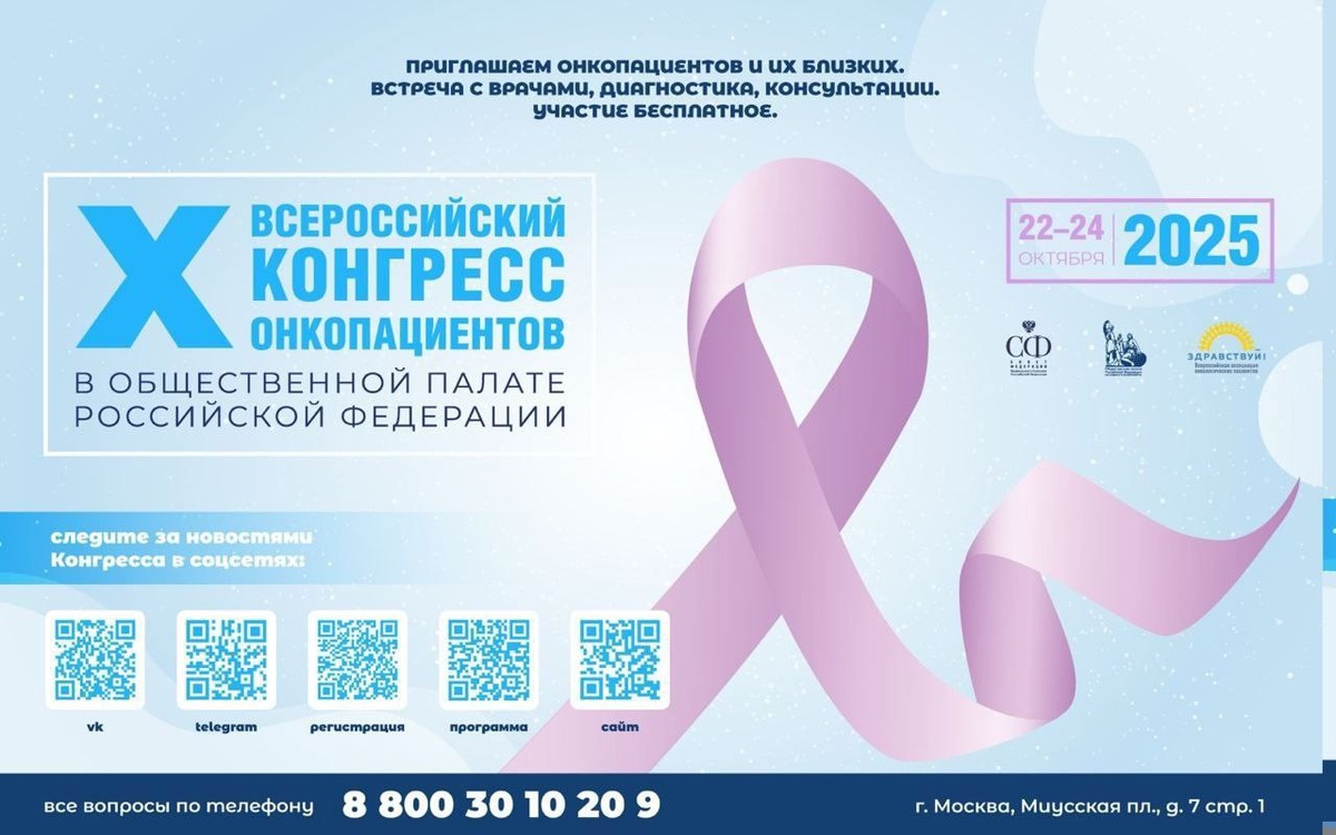 Х ВСЕРОССИЙСКИЙ КОНГРЕСС ОНКОПАЦИЕНТОВ С 22 по 24 октября 2025 года в Общественной палате Российской Федерации (г. Москва, Миусская пл., д. 7, стр. 1) состоится юбилейный X Всероссийский Конгресс онкологических пациентов, организованный Всероссийской общественной организацией помощи пациентам «Ассоциация онкологических пациентов «Здравствуй!» при поддержке Комиссии по здравоохранению Общественной палаты РФ. За 10 лет работы Конгресс стал важнейшей общественной площадкой для обсуждения актуальных вопросов оказания онкологической помощи. В этом году основное внимание будет уделено современным подходам к диагностике, лечению, реабилитации и паллиативной помощи. Среди ключевых тем — внедрение инновационных технологий, развитие онконастороженности, лекарственное обеспечение, телемедицина, поддерживающая терапия и реабилитация пациентов. Особое место в программе займут вопросы взаимодействия пациентских сообществ с медицинскими специалистами и органами власти, а также обсуждение новых ре