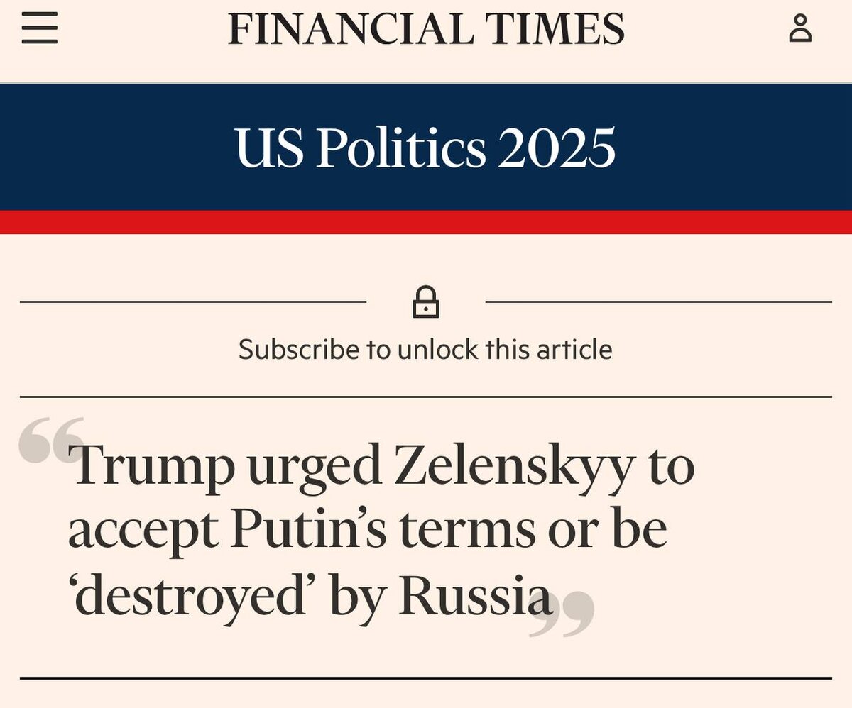 🇺🇸🇺🇦 Дональд Трамп на встрече с Зеленским в Вашингтоне призвал его принять условия России, иначе киевский режим будет «уничтожен», — Financial Times