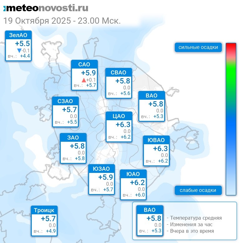 В 23:00 в Москве было от +5°C до +6.5°C, средняя температура +6°C #погода #Москва #осень #температура #19октября #воскресенье Перейти на сайт Прогноз погоды на 14 дней