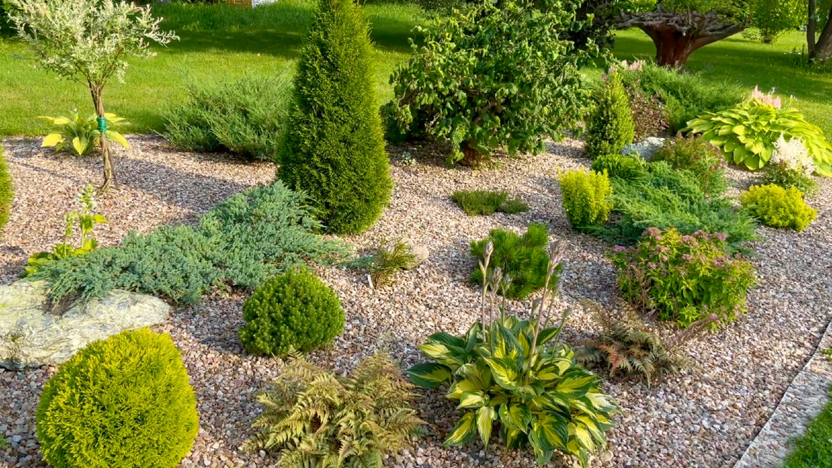 Красиво дополняющие друг друга вертикальный голубой можжевельник "Стрикта", туи "Даника Ауреа" с округлой формой кроны и золотистой хвоей, ярко-зеленая хвоя можжевельников "Минт Джулеп", вишневая листва подушковидного карликового барбариса "Багетелле" и две хосты с голубой и ярко-желтой окраской листвы дружат друг с другом, и каждое растение при этом вполне самодостаточно.