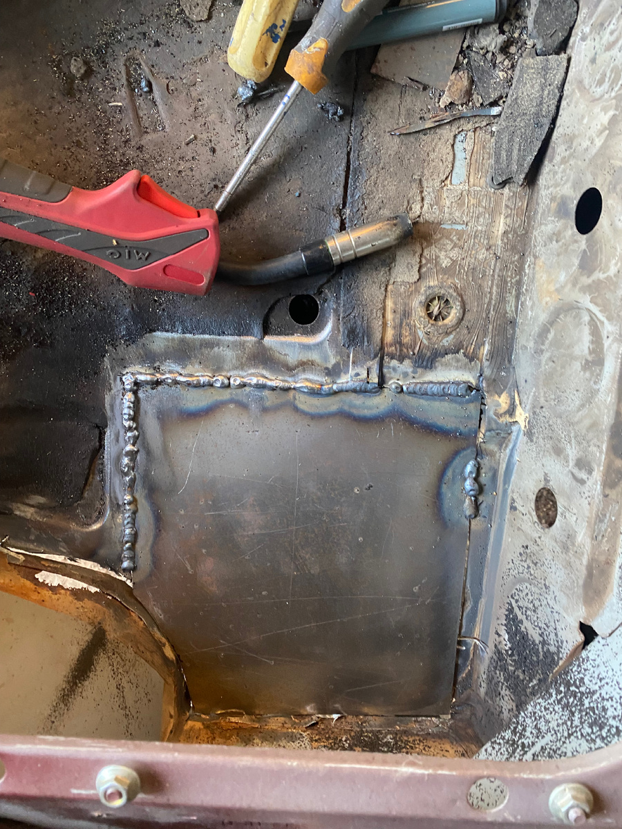 Площадки крепления реактивных тяг были уже меняны когда-то. В местах сварки не видно было следов грунта и герметика. Было похоже что покрывали мастикой , поэтому наверное всё сгнило в местах сварки. Площадки не пришлось высверливать и резать , я их просто оторвал. Прежде чем приваривать новые в местах где крепятся площадки реактивных тяг я вырезал и приварил 4 новых заплатки, по две на каждой стороне, днище в этих местах подгнило. Заодно вырезал и вварил 2 заплатки в днище ближе к центральной стойке. Они уже варились когда-то и из салона было намазано пушсалом. Мне это не понравилось и решил переварить. Расположение новых площадок реактивных тяг вымерял по контрольным точкам кузова. Поддомкратил площадки для плотного прилегание к днищу закрепил на саморезы, потом приварил. Старался варить сверху из салона по точкам, для надежности еще и снизу проварил . Прежде чем приваривать площадки и поддомкратники покрыл эпоксидным грунтом. С передними поддомкратниками пришлось немного помуча