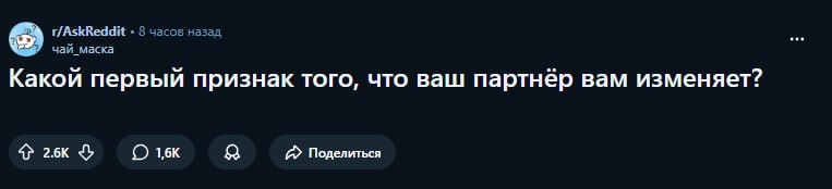 На реддите обсуждают по теме "Какой первый признак того, что ваш партнёр вам изменяет