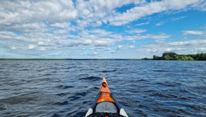 Когда я остановился, чтобы сделать фотографии, в каяк ударил сильный порыв ветра и стал сносить меня обратно в Нижегородскую область. Спешно взявшись за весло, я стал грести вперед и скоро приблизился к открытой воде.