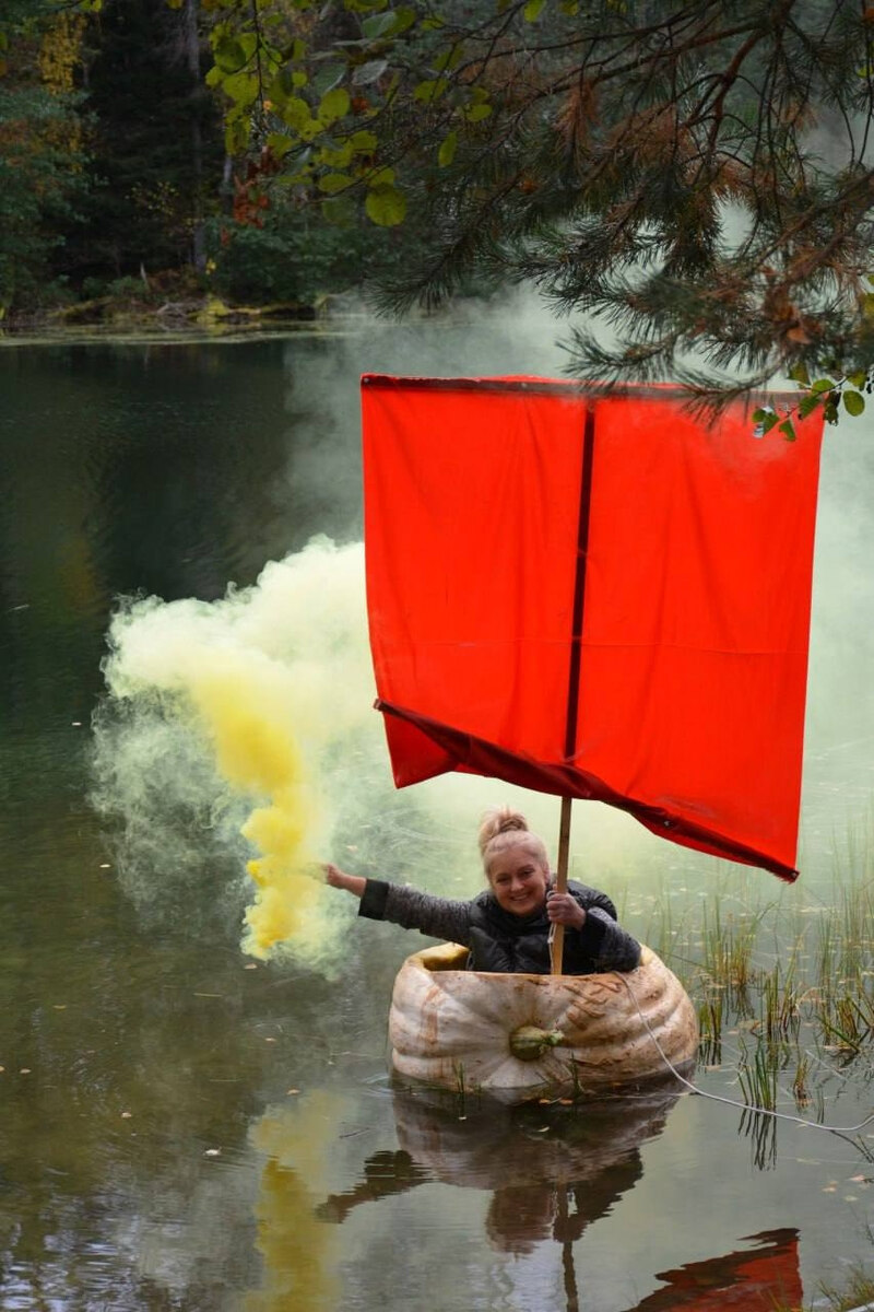 Заплыв на гигантской тыкве устроила петербурженка в Псковской области. Вес тыквы, которую Юлия Богданова вырастила на своей даче, — 221 килограмм. «Судно» она назвала «Емеля» и отправилась на нем по озеру Стречино.