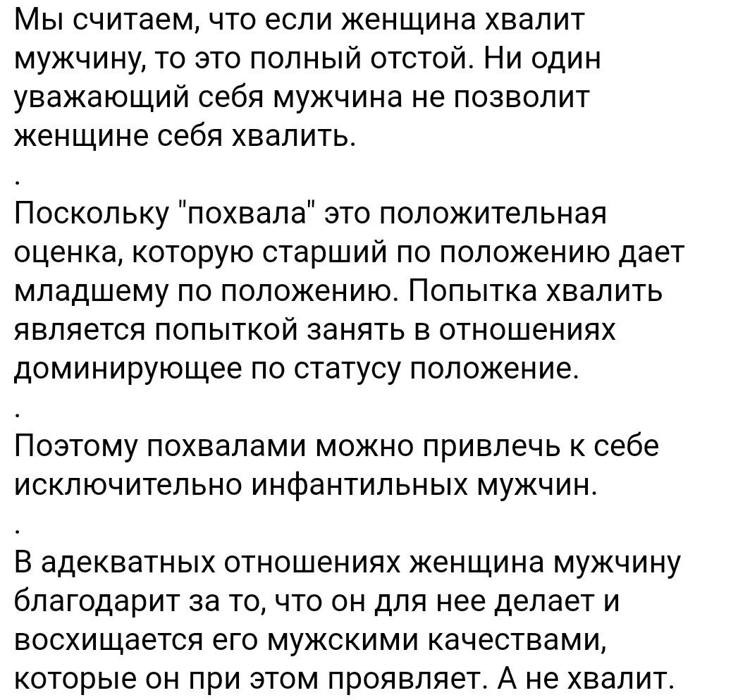 Давно хотела поделиться интересной находкой, да все как-то руки не доходили. Итак, недавно я узнала, что, кроме прочих запретов, женщина должна знать еще об одном. Мужчин нельзя... хвалить. Правда, я не придумываю: Вот прочитала я это высказывание и хвалить его автора мне не захотелось. А захотелось... пожалеть. И тому есть несколько причин. Мир автора крайне примитивен, он рассматривает отношения лишь с позиции статуса "кто доминирует". Для него люди делятся на "старших" (тех, кто оценивает) и "младших" (тех, кого оценивают). Здоровые партнерские отношения, основанные на взаимном уважении и равенстве, любви и эмпатии, в эту картину мира не помещаются. Я думаю, что в таком мире жить крайне сложно и неуютно, потому что постоянно приходится быть начеку, в любой момент ожидая, того, что тебя могут "подчинить". Этот человек действительно не понимает, что в здоровых отношениях похвала - это не "оценка", а поддержка, признание и искренняя радость за успехи партнера. Это способ сказать: "Я ви