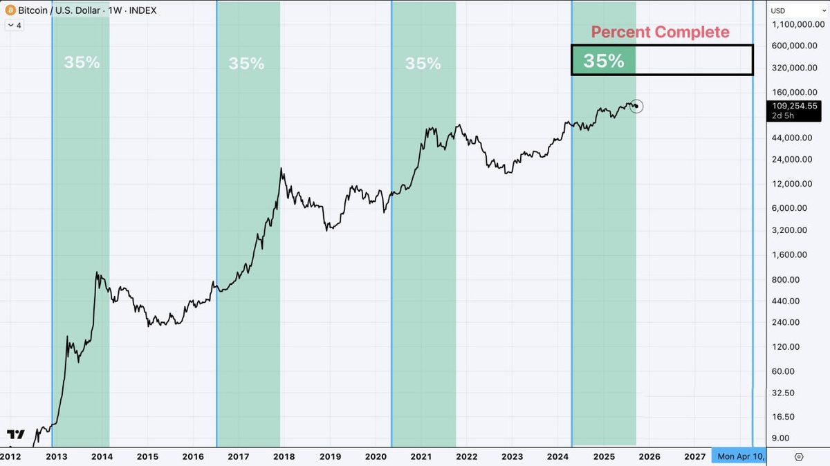 📊 Bitcoin is cruising at 35% of the cycle! 🚀 Every cycle hits this spot and influencers are already hollering “We’re early!” ⏳ But hold up, the clock is ticking! ➡️ In 2013: at 35%, the peak was just months away ➡️ In 2017: at 35%, the top was in that same year ➡️ In 2021: at 35%, the peak arrived in just 3 weeks ➡️ And here we are in 2025, right at that same marker! History might not repeat, but it definitely has a catchy tune! 🎶💸 #Bitcoin #CryptoCycle