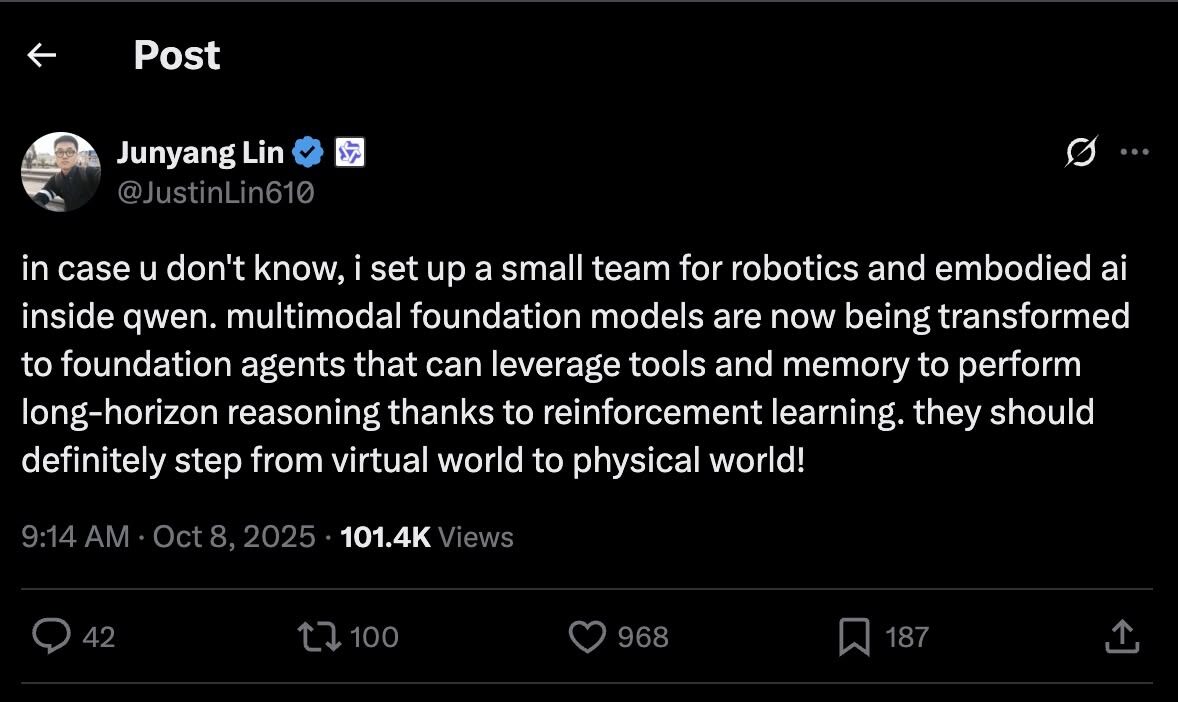 Команда Tongyi Qianwen в составе Alibaba создала отдел робототехники. Пока неясно, будет ли Alibaba производить физических роботов или ограничится ПО для чужого «железа». Рынок они выбрали весьма конкурентный, где Tesla, Boston Dynamics, Figure AI и десятки стартапов уже тестируют гуманоидов на складах и заводах (пока безуспешно), а китайские игроки вроде Unitree и Fourier Intelligence демпингуют по цене. Руководитель проекта Линь Цзюньян, один из первопроходцев мультимодальности в Китае, занимавшийся этим направлением ещё до эпохи GPT-4. Сейчас он ведёт флагманы Qwen3-Max и QwQ-32B. Он считает, что мультимодальные модели должны покинуть виртуальное пространство и действовать в реальности. Alibaba, по данным Frost & Sullivan, уже занимает 17,7% китайского корпоративного рынка LLM. Казалось бы, при таком спросе логично фокусироваться на масштабировании облачных сервисов, а не распылять ресурсы на физическую робототехнику с её капиталоёмкостью и долгим циклом разработки. Но в компании сч